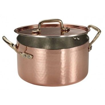 Cazo alto de cobre de 26 cm de diámetro y 14 cm de altura. Tanto las asas como el cuerpo del cazo están fabricados en cobre a mano en Italia, el interior del cazo está fabricado en cobre también a mano.