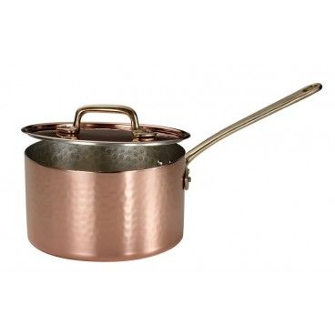 Cacerola alta de cobre de 24 cm de diámetro y 12,5 cm de altura. Tanto las asas como el cuerpo del cazo están fabricados en cobre a mano en Italia, el interior del cazo está fabricado en aluminio también a mano.