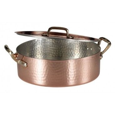 Cacerola baja de cobre de 24 cm de diámetro y 10 cm de altura. Tanto las asas como el cuerpo del cazo están fabricados en cobre a mano en Italia, el interior del cazo está fabricado en aluminio también a mano.