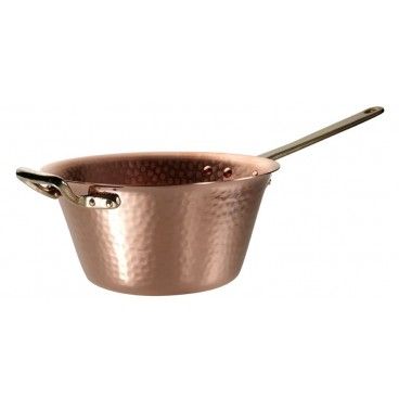 Cazo alto de cobre de 26 cm de diámetro y 14 cm de altura. Tanto las asas como el cuerpo del cazo están fabricados en cobre a mano en Italia, el interior del cazo está fabricado en cobre también a mano.