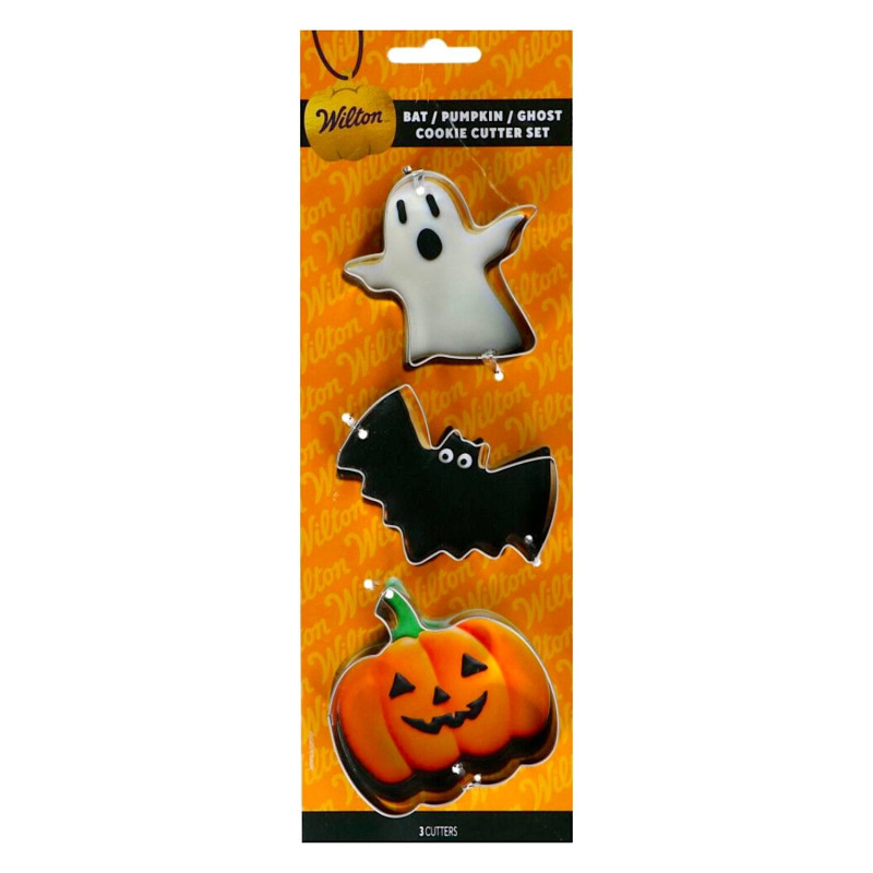 Juego de tres cortadores de Halloween: fantasma, calabaza y murciélago.