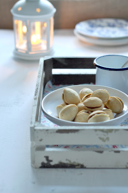 Para el montaje, sólo tendremos que rellenar con ayuda de una manga pastelera el centro de las galletitas con dulce de leche, colocamos trocitos de nueces sobre el dulce de leche y ponemos otra galletita encima.